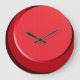 Moderne rote Wanduhr in Form eines halbmondförmigen Mondes mit einem leuchtenden roten Gittermuster im Inneren.