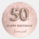 Elegant, klassisch, glamourös und mädchenhaft für eine 50. Geburtstagsfeier. Rose Gold und rot Rosa, Farbverlauf Hintergrund. Mit Rose vergoldet, rosa Tropfen, Farbe tropfend aussehen. Personalisieren und einen Namen hinzufügen. Mit dem Text: Happy Birthday. Der Text ist mit einem modernen, dunklen Rose gefärbten Handschrift geschrieben. Nummer 50 wird mit einem Schriftart im Ballonstil geschrieben.