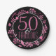 Liest rosa und Papierplatten des fünfzigstes Party des Geburtstages fabelhafte 50 der Frau 50 u. fabelhaft in rosa und im Grau auf einem schwarzen Kreis mit einer weißen Grenze. Schwarzer Hintergrund um die Ränder mit dem Zusammenbringen des rosa botanischen Wreath des Blätter und der Beeren. Elegante 50. Geburtstagsversorgungen für 50 jährige Divas. Andere fabelhafte 50. Geburtstags-Partyversorgungen sind in unserem Zazzle.com/angela65-Speicher.