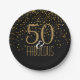 Der festlichen Frau, das Chicschwarze und Goldder fünfzigster Geburtstags-Partypapier-Teller mit ImitatgoldGlitter Confettipunkten zerstreuten über den schwarzen Hintergrund. Liest 50 u. fabelhaft im Gold und im Weiß. Elegante 50 u. fabelhafte 50. Geburtstagsversorgungen für 50 jährige Divas. Andere Papierzufuhren des fabelhaften 50. Geburtstags-Party sind in unserem Zazzle.com/angela65-Speicher.