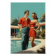 Vintages Bild der 50er Jahre mit einem charmanten Mann und einer Frau in einem kleinen roten Kleid, die sich am Pool amüsieren