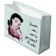 Große, glänzende Minzgeschenk-Tasche mit einem Bild einer brünetten 50er-Frau mit dem Finger auf ihrem Kinn, als ob sie bereit wäre, einen Gedanken auszudrücken. Anpassbarer Text. Sehen Sie die gesamte Nifty 50er Gift Bag Kollektion in den SONDERTOUCHS| Gastgeschenken
