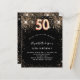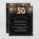 Eine moderne, stilvolle und glamouröse Einladung zu einer 50. Geburtstagsfeier. Ein schwarzer Hintergrund mit Glitzer aus Imitaten. Der Name ist mit einem modernen goldfarbenen handgeschriebenen Stilskript geschrieben. Personalisieren Sie Ihre Party-Daten und fügen Sie sie hinzu. Nummer 50 wird mit einem Schriftart im Ballonstil geschrieben, Skript.