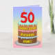 This upbeat and cheerful birthday themed greeting card design feature a cartoon-style depiction of a three-tier birthday cake having number-shaped candles on top showing the age 50, along with the message "HAPPY 50TH BIRTHDAY", and an editable recipient. The background of the front feys a multicolored pastel rainbow spectrum inspired gradient pattern. The inside has a customized birthday greeting message, or could perhaps be cleared and left blank if a message is to be written by hand instead. Auf Einladung von personalized birthday greeting card like this might be used to celebrate somebody's fiftieth birthday. [~ Z0000625]