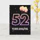 Party Ballons und Konfetti auf schwarzem Hintergrund mit der Neonnummer 52 für einen 52. Geburtstag.