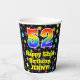 This colorful and fun birthday paper cup design features a large number “52” with a rainbow spectrum gradient inspired pattern, along with the message “Happy 52nd Birthday,”, and a custom name. The background features a colorful pattern featuring many star shapes with different colors and sizes. Vibrant, colorful paper cups like this might be fun to have at a birthday celebration/party being held to celebrate somebody’s 52nd birthday. [~Z0000540]