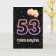 Party Ballons und Konfetti auf schwarzem Hintergrund mit der Neonnummer 53 für einen 53. Geburtstag.