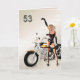 53. Geburtstag mit einem Motorrad. Ein Mädchen, das neben einem Motorrad stehend ist und auf die Happy Birthday Nachricht zeigt. Das Mädchen trägt Heelse und eine Baske. Sie ist groß, schlank und blond. Eine tolle Karte für den Mann, der seine Fahrräder Lieben!