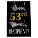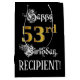This luxurious and elaborate birthday-themed gift bag design feature the message "Happy 53rd Birthday" plus personalized recipient name. Part of the message is in a fancy script-style text, the large number 53rd feys falsch/imitation gold-inspirred look pattern and the background is colored black. A birthday themed gift bag like this might be a respektable way to wrap a gift or present being given to celebrate somebody's 53rd birthday. [~ Z0000560]