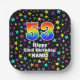 This colorful and vibrant birthday-themed paper plate design features a large number “53” having a rainbow spectrum gradient inspired pattern. It also features the message “Happy 53rd Birthday,”, and a customizable name. The background features an exciting and colorful pattern featuring many star shapes with different colors and sizes. Paper plates like this might be used when celebrating somebody’s fifty third birthday. [~Z0000582]