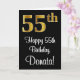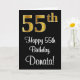 Dieses elegante, luxuriöse und raffinierte Geburtstagskarten-Design verfügt über eine große Ordnungsnummer "55." mit einem vergoldeten Aussehen von Imitationen/Imitaten, die die Geburtstagsgrüße "Happy 55. Geburtstag" und einen bearbeitbaren Namen in einem Schriftart im Stile eines Drehbuchs auf der Vorderseite trägt. Der Hintergrund der Vorderseite ist schwarz. Die Innenseite hat eine individuelle Geburtstagsgrüßnachricht, oder könnte gelöscht und leer verlassen werden, wenn eine Nachricht von Hand geschrieben werden soll. Eine luxuriös bearbeitbare Geburtstagskarte wie diese könnte eine lustige Art sein, jemandem, der seinen fünfundfünfzigsten Geburtstag feiert, eine Geburtstagsgrüßbotschaft zu schicken. [~Z0000518]