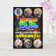 Die Vorderseite dieses lustigen und optimistischen Geburtstags-Thema Grußkarten-Design zeigt eine große Zahl "55" mit einem pulsierenden Regenbogenspektrum inspiriert Farbverlaufsmuster, zusammen mit der Meldung "HAPPY 55th BIRTHDAY", und einem anpassbaren Namen, auf einem bunten, brennenden Feuerwerk inspiriert Muster. In der Nähe von oben und unten sind Bilder, die individuell angepasst werden können, vielleicht mit Fotos der Familie und Freunden des Empfängers. Die Innenseite hat eine personalisierte Geburtstagsgrüßbotschaft, oder könnte gelöscht und leer verlassen werden, wenn eine Nachricht von Hand geschrieben werden soll. Eine fröhliche, maßgeschneiderte Geburtstagskarte wie diese kann zum Feiern des fünfundfünfzigsten Geburtstags geschickt werden. (Fotografie © Storytree Studios, Stanford, CA.) [~Z000660]