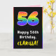Dieses fröhliche und kühn gestaltete Geburtstagskartendesign weist eine große Zahl "56" auf, die ein vielfarbiges Regenbogenspektrum inspiriert Farbverlaufsmuster, die Meldung "Happy 56th Birthday" und einen benutzerdefinierten Empfängernamen hat. Im Inneren befindet sich eine personalisierte Geburtstagsgrüßbotschaft, oder man könnte sie löschen und leer verlassen werden, wenn eine Nachricht von Hand geschrieben werden soll. Eine positive, anpassbare Geburtstagskarte wie diese könnte eine lustige Art sein, Geburtstagsgrüße an jemanden zu senden, der seinen sechsundfünfzigsten Geburtstag feiert. [~Z0000627]