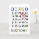 56. Geburtstagkarte. Sage einen Glückwunsch zum Geburtstag zu einem Bingo-Spieler mit einer Bingokarte. Das Alter ist rot eingekreist. Ein Bingo-verrückter Spieler bekommt einen Riesenkick aus dieser Karte! Copyright Norma Cornes.