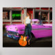 Schöne Frau stehend vor einem 50er-Abend und einem Cabrio-Auto aus dem Jahr 1956 mit ihrer Rockabilly-Gitarre