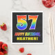 Dieses lustige, fröhliche und farbenfrohe Geburtstagsthema Papier Serviette Design weist eine große Zahl "57" und die Meldung "HAPPY BIRTHDAY", beide mit einem Regenbogenspektrum inspirierte Musterfärbung, zusammen mit einem kühnen gelben benutzerdefinierten Empfängernamen. Der Hintergrund ist schwarz. Spaß, bearbeitbare Papierservietten wie diese können bei einer Feier genutzt werden, um jemandes 57. Geburtstag zu ehren. [~Z0000476]
