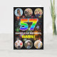 Die Vorderseite dieses aufregenden und optimistischen Geburtstagskarten-Designs zeigt eine große Zahl "57" mit einem vielfarbigen Regenbogenspektrum inspirierten Farbverlaufsmuster, zusammen mit der Meldung "HAPPY 57. BIRTHDAY" und einem individuelle Name, auf einem farbenfrohen Feuerwerk inspiriert Muster. Oben und unten auf der Vorderseite sind Bilder, die individuell angepasst werden können, vielleicht mit Fotos der Familie und Freunde des Empfängers. Die Innenseite hat eine individuelle Geburtstagsgrüßnachricht, oder könnte gelöscht und leer verlassen werden, wenn eine Nachricht von Hand geschrieben werden soll. Eine fröhliche, maßgeschneiderte Geburtstagskarte wie diese kann dazu verwendet werden, jemandes siebenundfünfzigsten Geburtstag zu feiern. (Fotografie © Storytree Studios, Stanford, CA.) [~Z000660]