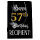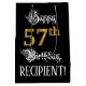 This opulent and luxurious birthday-themed giftbag design feature the message "Happy 57th Birthday", along with an editable recipient name. Part of the message is in an elegant script-style text. The large number 57th Feature ist falsch/imitation gold-inspirred look pattern. Background is colored black. A gift-bag like this might be used when wrapping ohrs being given to somebody in celebration of their fifty seventh birthday. [~ Z0000560]