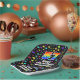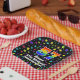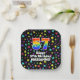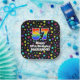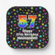 This fun and exciting birthday paper plate design features a large number “57” with a rainbow spectrum gradient inspired pattern, along with the message “Happy 57th Birthday,”, and a custom name. The background features an exciting and colorful pattern having many star shapes with different sizes and colors. Joyful birthday themed paper plates like this might be used at a party in celebration of somebody’s fifty seventh birthday. [~Z0000582]