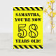 Auf der Vorderseite dieses lustigen und kühnen Geburtstagskarten-Designs finden Sie einen individuelle Name und die Meldung "YOU’RE NOW 58 YEARS OLD!" in schwarzer Schablone auf gelbem Hintergrund. Die Vorderseite weist auch ein auffälliges schwarz-gelb gestreiftes Muster an den oberen und unteren Rändern auf. Im Inneren befindet sich eine individuell anpassbare Geburtstags-Grußnachricht, oder vielleicht kann gelöscht und links werden, wenn eine Nachricht von Hand geschrieben werden soll. Eine solche individuelle Geburtstagskarte könnte eine lustige Art sein, Geburtstagswünsche an jemanden zu senden, der seinen achtundfünfzigsten Geburtstag feiert. [~Z0000413]