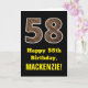 Diese rustikale, lustige Geburtstagskartendesign mit einer großen Zahl "58" mit einem Imitat Holzkorn inspirierten Stil Muster auf der Vorderseite. Auf der Vorderseite steht auch die Geburtstagsgrüßbotschaft "Happy 58 th Birthday" und ein bearbeitbarer Empfängername. Im Inneren befindet sich eine personalisierte Geburtstagsgrüßbotschaft, oder man könnte sie löschen und leer verlassen werden, wenn eine Nachricht von Hand geschrieben werden soll. Eine individuell anpassbare Geburtstagskarte wie diese könnte eine lustige Art sein, jemandes achtundfünfzigsten Geburtstag anzuerkennen. [~Z0000433]
