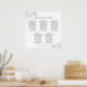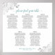 Dieses 5-Tisch Hochzeitsstühle-Diagramm wird Ihren Gästen helfen, den richtigen Tisch am Empfang zu finden. Das Design ist schlicht und elegant mit dunkelgrauem und aquamarinem oder türkisfarbenem Text auf weißem Hintergrund und zartem silberfarbenem Imitat mit floralen Filigree in den Ecken. Der Titel lautet "Bitte finden Sie Ihren Tisch" in einer eleganten Skriptkalligraphie. Raffiniert und elegant. Einschließlich Tischbelegung für 50 Gäste mit 10 Plätzen pro Tisch.