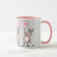 Fun Rabbit Design Tasse für jemanden mit einem 5 Buchstaben Namen. Fun Rosa und Weiße Tasse mit Darstellung der Kaninchen in Rosa und Blau. Die Kaninchen halten Karten auf, um den Namen zu benennen. Beispielname ist Peter.