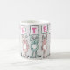 Fun Rabbit Design Tasse für jemanden mit einem 5 Buchstaben Namen. Beispielname ist Peter. Niedliche Kaninchen. Spaß Weiße Tasse mit der Illustration von Kaninchen in Rosa und Blau. Die Kaninchen halten Karten auf, um den Namen zu benennen.
