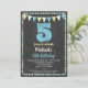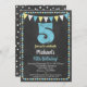 Eine funky Chalkboard blau und gelb 5. Geburtstagseinladung mit kreidem Kreidetext oben mit Kalkboard-Hintergrund, Flaggen und einem niedlichen Polka-Dot-Rahmen.
