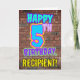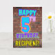 An der Vorderseite dieses lustigen Geburtstagskarten-Designs steht die Meldung "HAPPY 5TH BIRTHDAY" mit einem lebhaften, bunten, urbanen Straßenkunst und Graffiti-inspirierten Aussehen sowie einem bearbeitbaren Empfängernamen. Der Hintergrund der Vorderseite weist ein Muster auf, das durch das Aussehen einer Ziegelwand inspiriert wird. Die Innenseite hat eine personalisierte Geburtstagsgrüßbotschaft, oder könnte gelöscht und leer verlassen werden, wenn eine Nachricht von Hand geschrieben werden soll. Eine lustige, personalisierte Geburtstagskarte wie diese kann zum Feiern des fünften Geburtstags verschickt werden. [~Z0000531]