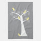 Fünf bezaubernde, abstrakt-gelbe Vögel hängen in einem weißen Baum vor grauem Hintergrund auf Küchentüchern.