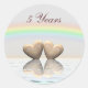 Sticker mit meinem originellen Kunstwerk von zwei hölzernen Herzen, die unter einem Regenbogen auf dem Wasser schwimmen. Der anpassbare Text sagt "5 Jahre".