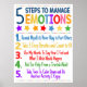 5 SCHRITTE ZUR VERWALTUNG EMOTIONS Poster, um in einem Schulberater, Beratungsbüro für Kindertherapie, Büro für Kinderpsychologen, Büro für Schulpsychologe, Sozialarbeiter, Büro für Sozialarbeiter für Schularbeit oder Kinderpsychologe zu verwenden. Eine großartige, zum Nachdenken anregende Kunst-Dekoration für die Verhaltenstherapie. Eine großartige, farbenfrohe, auffällige Grafik, die die Aufmerksamkeit der Kinder erweckt und sie daran erinnert, wie sie mit ihren Emotionen umgehen können.