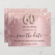 Eine trendige und mädchenhafte Save the Date-Karte für eine 60. Geburtstagsfeier. Rosa Farbverlaufshintergrund mit rosa und Imitate silberne Glitzer Tropfen und Staub. Personalisieren und fügen Sie Datum und Namen/Text hinzu. Der Text: Save the Date wird mit einem großen angesagten, handgeschriebenen Stilskript mit Swashes geschrieben. Nummer 60 mit einem Schriftart im Ballonstil.