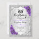 Einladung zum 60. Geburtstag. Elegantes Blumendesign in Silber und lila. Features Imitate Glitzer silberne Streifen, lila Rose stilvolle Skript-Schriftart und Konfetti. Ideal für eine gläserne Geburtstagsfeier.