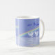 Kaffee-Tasse mit meinem ursprünglichen Bild 3d der Diamantherzen, die auf das Wasser unter einen Regenbogen mit kundengerechtem Text schwimmen