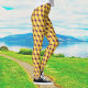 Ladys Leggings in einem Retro-Stil mit orangefarbenen, gelben und lila Reihen. Ein Wiederholmuster reflektierender Ovale schafft ein gewagtes nostalgisches Design.