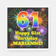 Dieses fröhliche und aufregende Geburtstagspapier serviert eine große Zahl "61" mit einem farbenprächtigen, inspirierten Regenbogenspektrum-Muster, zusammen mit der Meldung "Happy 61. Birthday" und einem personalisierten Namen. Der Hintergrund zeigt ein lebendiges und farbenprächtiges, aufstechendes, feierliches Feuerwerk inspiriertes Muster. Papierservietten wie diese können bei einem Party zum Feiern des einundsechzigsten Geburtstages von jemandem verwendet werden. [~Z0000574]