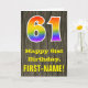 Die Vorderseite dieses bunten und dennoch rustikalen Geburtstagskarten-Design verfügt über eine große Zahl "61" mit einem Regenbogenspektrum inspirierte Muster. Es enthält auch die Meldung "Happy 61st Birthday", und einen benutzerdefinierten Empfängernamen. Der Hintergrund der Vorderseite der Karte weist ein rustikales Imitat-Kornmuster auf. Im Inneren befindet sich eine individuell anpassbare Geburtstags-Grußnachricht, oder vielleicht kann gelöscht und links werden, wenn eine Nachricht von Hand geschrieben werden soll. Eine personalisierte Geburtstagskarte wie diese könnte eine lustige Art sein, eine Botschaft zum Feiern des einundsechzigsten Geburtstages von jemandem zu senden. [~Z0000419]
