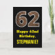 Dieses lustige, rustikale Geburtstagskartendesign zeigt eine große Zahl "62" mit einem Imitat Holzkorn inspiriert Look Muster auf der Vorderseite. Auf der Vorderseite steht auch die Geburtstagsgrüßbotschaft "Happy 62. Birthday" und ein benutzerdefinierbarer Empfängername. Im Inneren befindet sich eine personalisierte Geburtstagsgrüßbotschaft, oder man könnte sie löschen und leer verlassen werden, wenn eine Nachricht von Hand geschrieben werden soll. Eine personalisierte Geburtstagskarte wie diese könnte eine lustige Art sein, eine Botschaft zum Feiern des zweiundsechzigsten Geburtstages von jemandem zu senden. [~Z0000433]