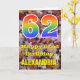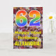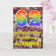 An der Vorderseite dieses bunten, herbstthematischen und rustikalen Geburtstagskarten-Designs steht eine große Zahl "62" mit einem inspirierten Regenbogengefälle, zusammen mit der Meldung "Happy 62nd Birthday" und einem personalisierten Namen. Die Vorderseite zeigt einen Hintergrund mit rustikalen gefallenen Herbstblättern. Im Inneren befindet sich eine individuell anpassbare Geburtstags-Grußnachricht, oder vielleicht kann gelöscht und links werden, wenn eine Nachricht von Hand geschrieben werden soll. Eine individuell anpassbare Geburtstagskarte wie diese könnte eine lustige Art sein, Geburtstagswünsche an jemanden zu senden, der seinen zweiundsechzigsten Geburtstag feiert. [~Z0000384]