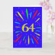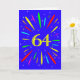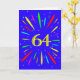 Eine explosive 64. Geburtstagskarte! Was für eine wunderbare Art, Geburtstagsgrüße zu schicken. Die Zahl 64 in hellgelb mit einer Explosion von hellen Farben und Sternen.