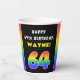 Dieses kühn und fröhlich geburtenorientierte Papier-Becherdesign zeigt eine große Zahl "64" mit einem farbenfrohen Regenbogenspektrum, inspiriert Farbverlaufsmuster, zusammen mit der Meldung "HAPPY 64. BIRTHDAY" und einem personalisierten Empfängernamen. Papiertassen wie diese können bei einer Geburtstagsparty zur Feier des vierundsechzigsten Geburtstages von jemandem benutzt werden. [~Z0000639]