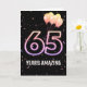 Party Ballons und Konfetti auf schwarzem Hintergrund mit dem Neon Nummer 65 für einen 65. Geburtstag.