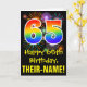 Die Vorderseite dieses lustigen, farbenfrohen und aufregenden Geburtstagskarten-Designs zeigt eine große Zahl "65" mit einem inspirierten Muster des Regenbogenspektrums, zusammen mit der Meldung "Happy 65. Geburtstag" und einem benutzerdefinierten Empfängernamen. Die Vorderseite weist zusätzlich ein buntes Hintergrundmuster auf, das durch das Bersten von feierlichen Feuerwerken wird. Das Innere verfügt über eine eigene Geburtstagsgrüße oder könnte gelöscht und links werden, wenn eine Nachricht von Hand geschrieben werden soll. Eine individuell gestaltbare Geburtstagskarte wie diese könnte eine lustige Art sein, jemandes fünfundsechzigsten Geburtstag anzuerkennen. [~Z0000442]
