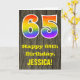 Die Vorderseite dieses bunten und dennoch rustikalen Geburtstags-Thema Grußkarte Design zeigt eine große Zahl "65" mit einem Regenbogenspektrum inspirierten Muster, zusammen mit der Meldung "Happy 65 th Birthday," und einem personalisierten Empfängernamen. Der Hintergrund der Vorderseite der Karte zeigt ein rustikales Imitat Holzkorn inspirierte Muster. Im Inneren befindet sich eine bearbeitbare Geburtstags-Grußnachricht, oder man könnte sie löschen und leer verlassen werden, wenn eine Nachricht von Hand geschrieben werden soll. Eine solche individuelle Geburtstagskarte könnte eine lustige Art sein, Geburtstagwünsche an jemanden zu senden, der seinen fünfundsechzig Geburtstag feiert. [~Z0000419]