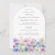 Elegante Aquarellbilder schaffen am Ende dieser bogenförmigen Einladung einen Blumenrand. Die lila, pinkfarbenen, blauen und weißen Blume sind die Blume des Septembermonats, die das passende Motiv für Ihren Geburtstag im September darstellt.