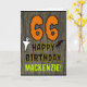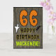 Die Vorderseite dieser spöttischen und beängstigenden Halloween Geburtstagskarte mit einem Thema, das eine große Zahl "66" aufweist. Es enthält auch die Meldung "HAPPY BIRTHDAY", und einen bearbeitbaren Namen. Auf der Vorderseite sind auch Fledermaus und Gespenst dargestellt. Im Inneren befindet sich eine benutzerdefinierte Geburtstagsgrüßbotschaft, oder man könnte sie löschen und leer verlassen werden, wenn eine Nachricht von Hand geschrieben werden soll. Eine personalisierte Geburtstagskarte wie diese könnte eine lustige Art sein, eine Nachricht zum Feiern des sechsundsechzigsten Geburtstags von jemandem zu senden, der auch auf den 31. Oktober fällt (Halloween). [~Z0000410]