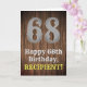 Dieses Country-Aussehen und American Wild West inspiriert Geburtstag Grußkarte Design zeigt eine große rustikale Look Nummer "68", die Meldung "Happy 68 th Birthday", ein personalisierter Name, und ein Imitat/Imitation Holz Getreide inspirierte Look Muster Hintergrund. Die Innenseite hat eine individuelle Geburtstagsgrüßnachricht, oder könnte gelöscht und leer verlassen werden, wenn eine Nachricht von Hand geschrieben werden soll. Eine bearbeitbare Geburtstagskarte wie diese könnte dazu benutzt werden, den achtundsechzigsten Geburtstag von jemandem zu bestätigen. [~Z0000469]