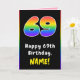 Dieses fröhliche und kühn gestaltete Geburtstagskartendesign zeigt eine große Zahl "69" mit einem farbenfrohen Regenbogenspektrum, inspiriert Farbverlaufsmuster, zusammen mit der Meldung "Happy 69th Birthday" und einem anpassbaren Empfängernamen. Die Innenseite hat eine individuelle Geburtstagsgrüßnachricht, oder könnte gelöscht und leer verlassen werden, wenn eine Nachricht von Hand geschrieben werden soll. Eine lustige, personalisierte Geburtstagskarte wie diese könnte benutzt werden, um jemandes neunundsechzigsten Geburtstag zu bestätigen. [~Z0000627]